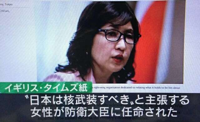 たとえば、英タイムズ紙は3日付電子版で、「戦中日本の残虐行為否定論者が防衛トップに」(Atrocity denier set to be Japan's defence chief)との見出しで、冒頭から稲田氏について「第二次世界大戦中の日本が数々の残虐行為を犯したという認識に異議を唱え、日本の核武装をも検討すべきとする女性」と紹介した。