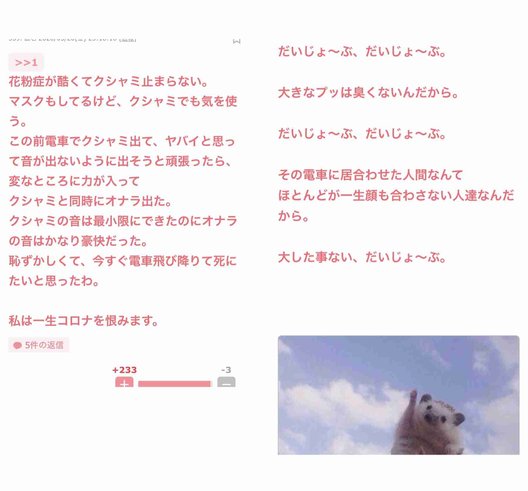 このトピのあるあるで、ついつい画像の方のプラスを押しちゃって画面がデカくなるんだよなーなんて思ってたら、主の投稿で早速画像の方にプラスしちゃったよ!+226