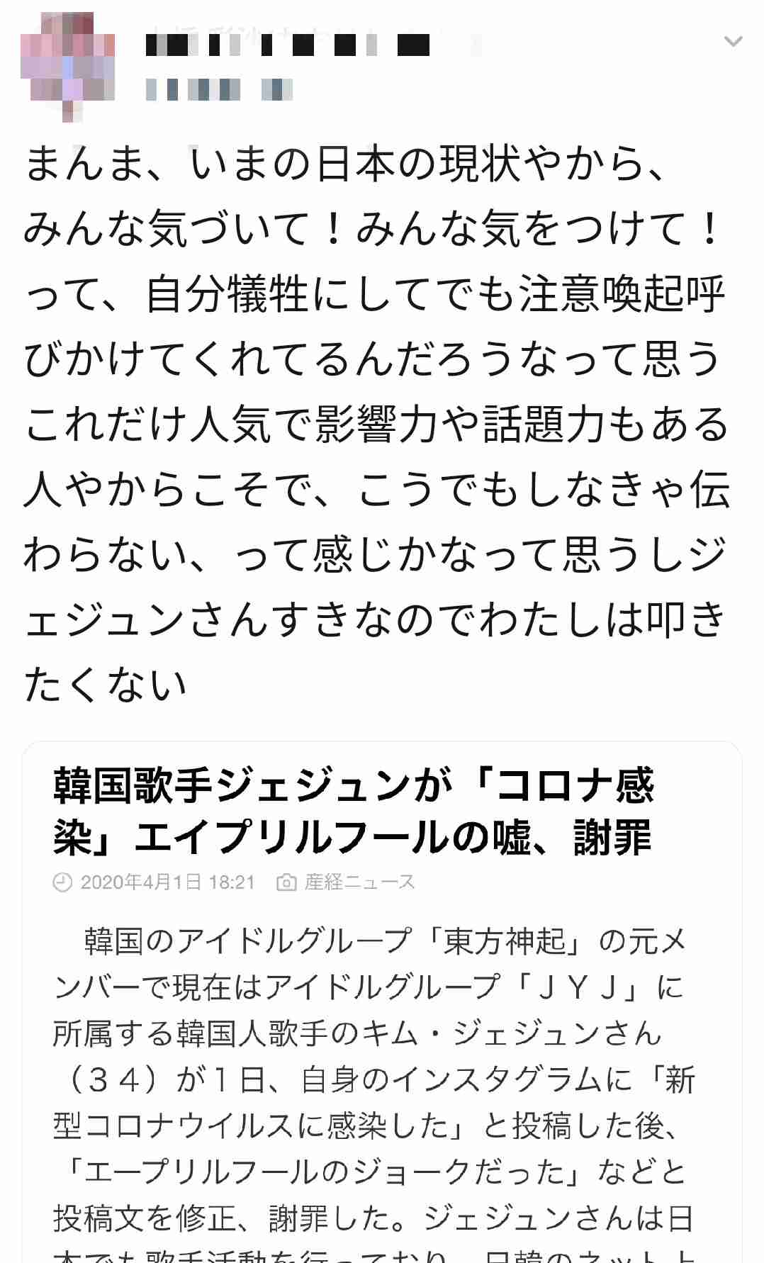 韓国の人気音楽グループ、東方神起の元メンバーのジェジュンさんが、自身のインスタグラムで、新型コロナウイルスに感染したと投稿しましたが、その後、エープリルフールの冗談だったとして、感染の事実はなかったと発表しました。