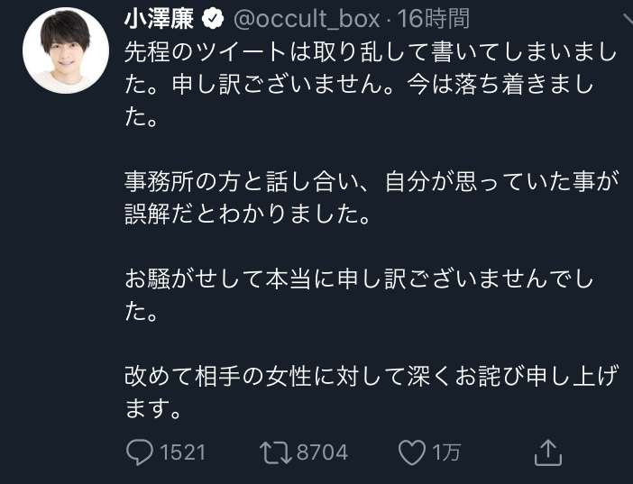 なんで謝罪文消したの??やっぱ謝るつもりなかったのか?それともファンのコメントが痛すぎて消したの?(笑)小澤廉弁護士を立て無実主張し開き直り!盲目ファン「れんれんに励ましの年賀状書こ!」「芸の肥やしにして」低レベル擁護 | りりあんニュースririannews.com文春により報道された当時16歳だったA子さんにDVを日常的に行っていたり中絶をせまりお腹を執拗に殴るなどの行為に及んでいた小澤廉。文春砲後ツイッターは鍵をかけて投稿もほとんど削除していましたが、15日午後ツイッターを公開して更新。そこには上辺だけの謝罪文...