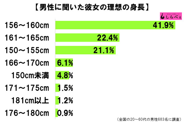 彼女にしたい女性の身長は、70%の男性が160センチ以下を理想としている。![]()