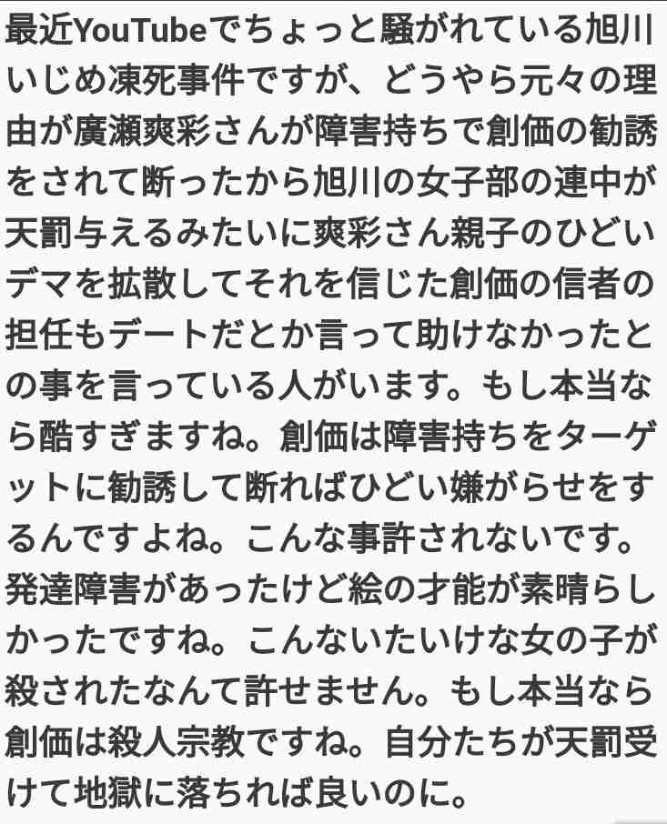 あの地域では他にも不審死してる女の子が居て、少女売春、創価学会、暴力団、爽彩さんは監禁され最後気を失わされ外に放置され殺された、など虐めとは違う犯罪が行われていたという話が出ています