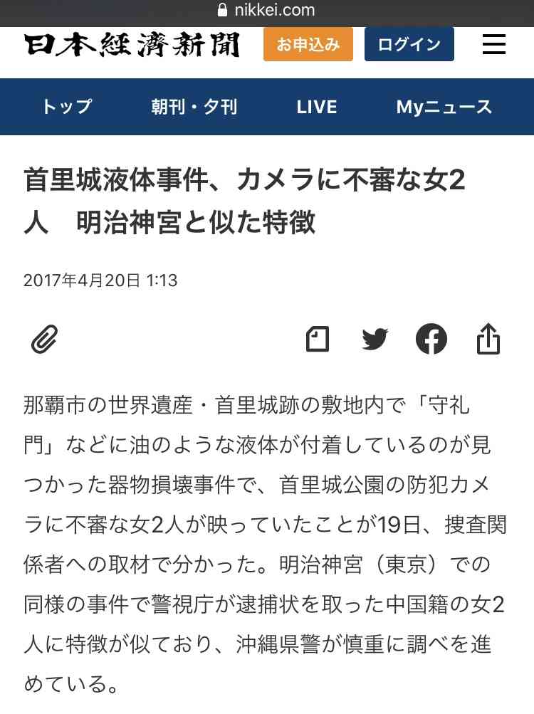 那覇市の世界遺産・首里城跡の敷地内で「守礼門」などに油のような液体が付着しているのが見つかった器物損壊事件で、首里城公園の防犯カメラに不審な女2人が映っていたことが19日、捜査関係者への取材で分かった。明治神宮(東京)での同様の事件で警視庁が逮捕状を...