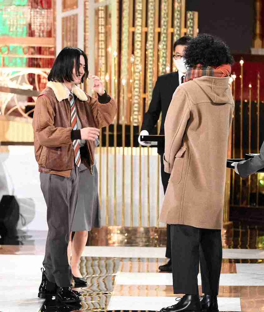 小栗は、菅田が主演のフジテレビ系ドラマ「ミステリと言う勿れ」の久能整に扮した姿で登場。<略>ドラマ「ミステリと言う勿れ」の公式ツイッターでも<略>「ちなみに、小栗さんのあの髪は地毛だそうです!コレもビックリ」と、驚きの情報を提供している。