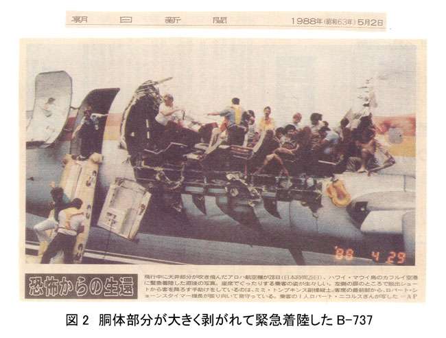 乗客の一人が30センチくらいの亀裂が搭乗口あたりにあることを確認していたけど、放っておいて飛びはじめたら気圧や強風によりその亀裂がどんどん拡大して中にも風が吹くようになってあっという間に飛行機はボロボロになって天井がぶっ飛んだという事故
