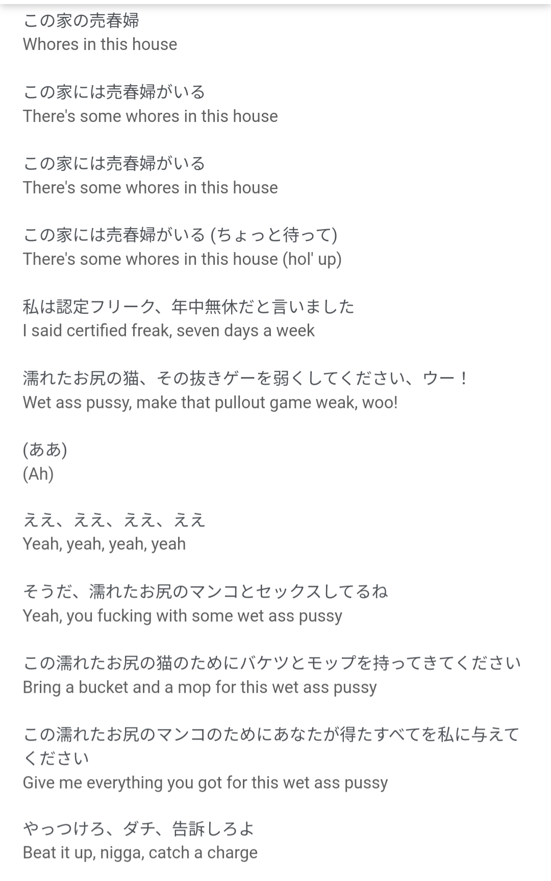 歌詞もそもそもほぼ全て露骨にセックスとかドラッグとかが出てきて、学校では不適切だとは思う(顔に乗るとか、あそこをなめる、とかあからさまに性器の話とかそういう歌詞ばかりだよ…)+424