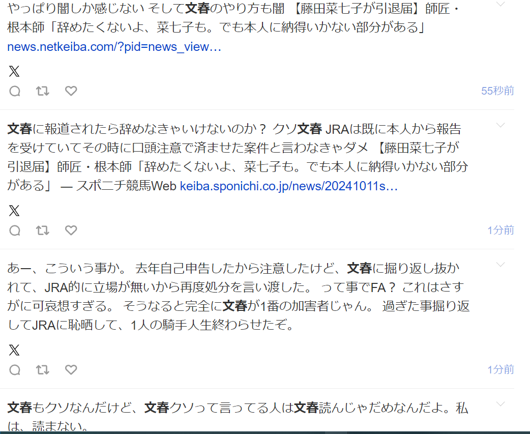 厳重注意で処分は終わったはずなのにそれを文春により蒸し返されて引退ならだいぶ話違うけどJRAちゃんと説明して欲しい+48