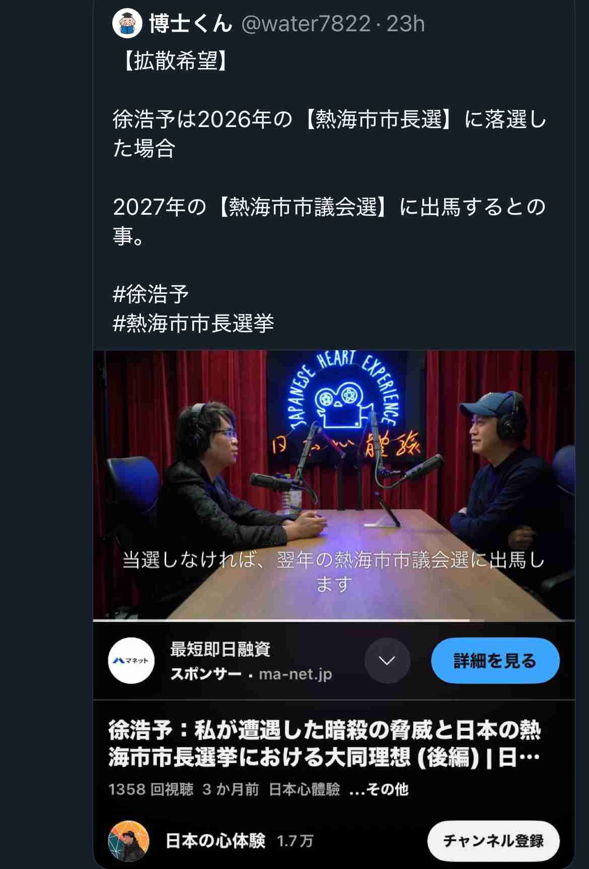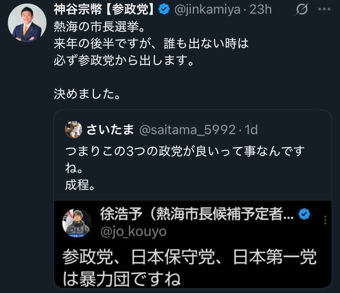 【拡散希望】 徐浩予は2026年の【熱海市市長選】に落選した場合 2027年の【熱海市市議会選】に出馬するとの事。 #徐浩予 #熱海市市長選挙 https://t.co/DV1yMiTW8J