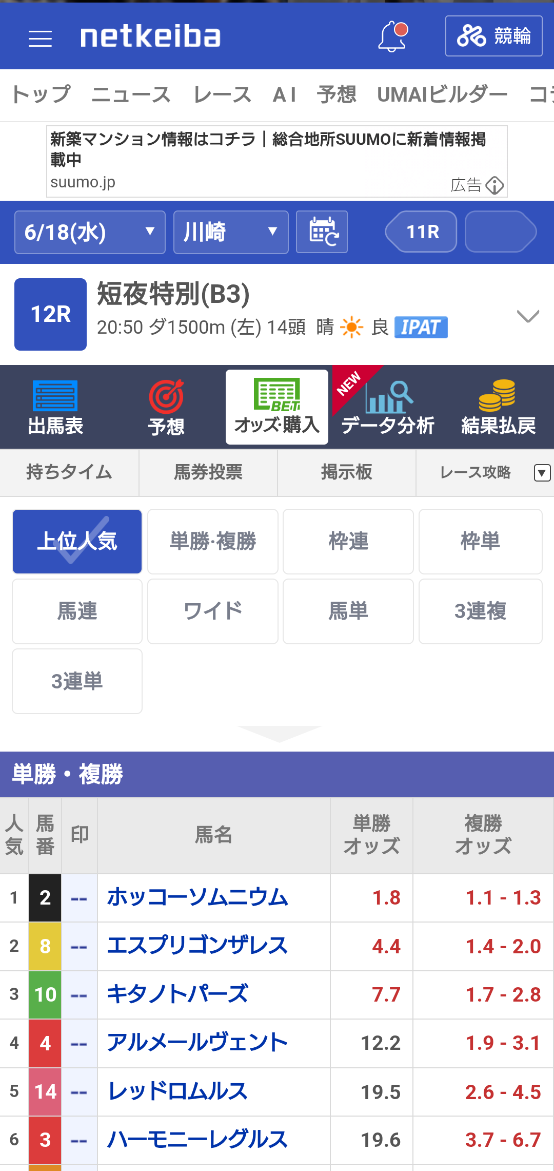 6月18日の川崎競馬場で20時50分出走のレースだね