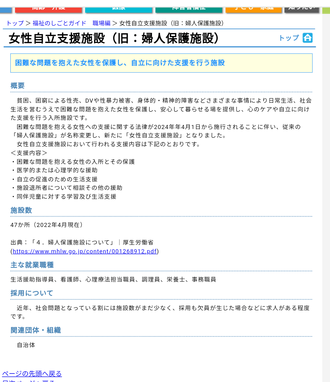 一昔前の女性保護施設(今の母子施設)は困窮して売春で稼ぐしか無かった女性の保護施設で、売春を辞めさせ売春以外の形で自立して生活出来るような職業訓練も行う教育施設だった。