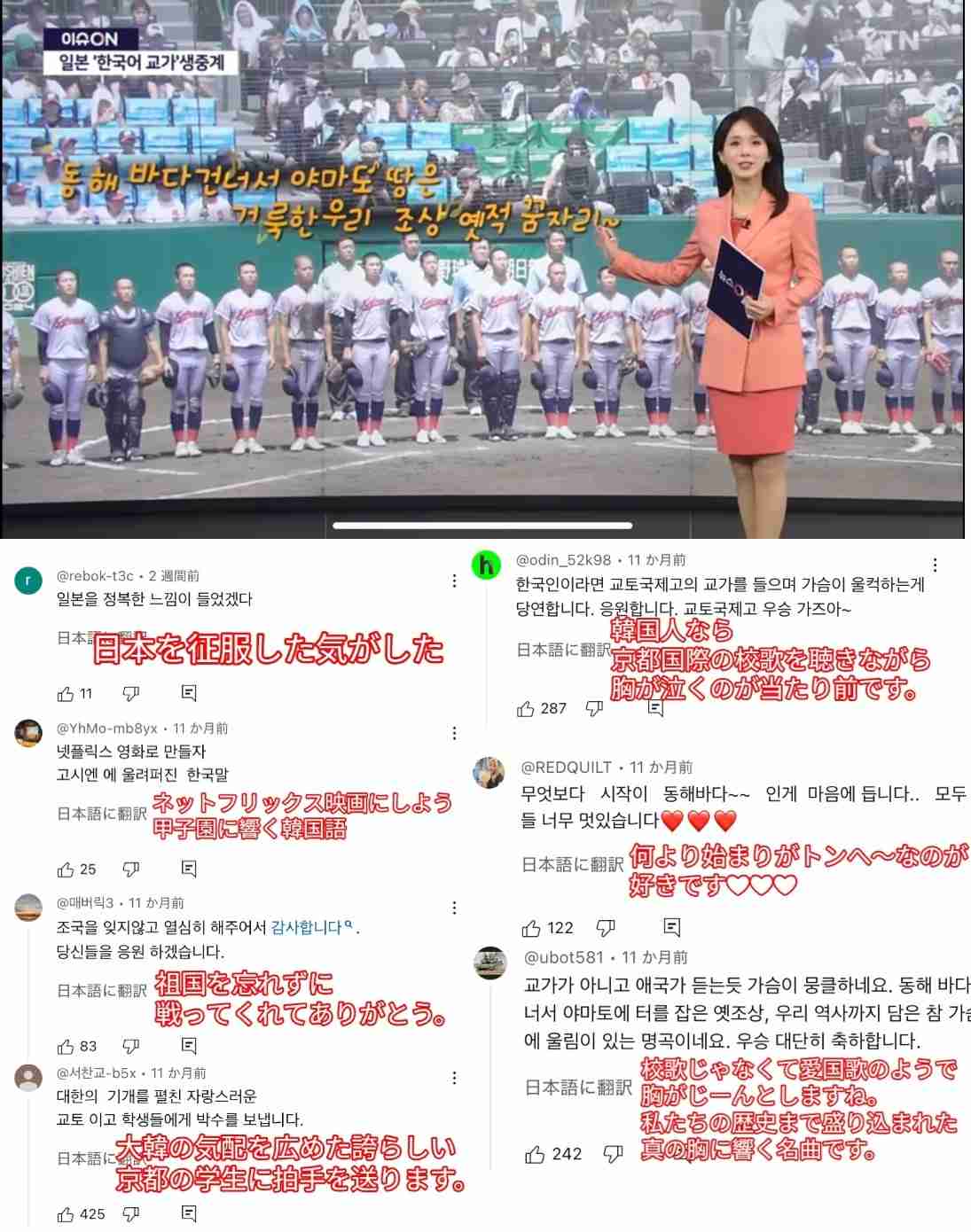 韓国で京都国際の選手たちがほぼ全員韓国人or帰化した韓国系だと信じられ甲子園優勝が「日本を征服した」「韓民族の優秀性だ」「これが大韓民国の血統だ」等々言われてて不快