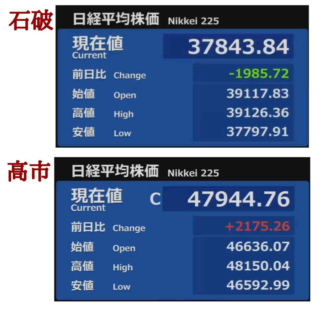 石破の時は日経平均株価は暴落して石破ショックって名前ついたよ。岸田の時は6日連続下落。高市さんで日経平均は暴騰。+3