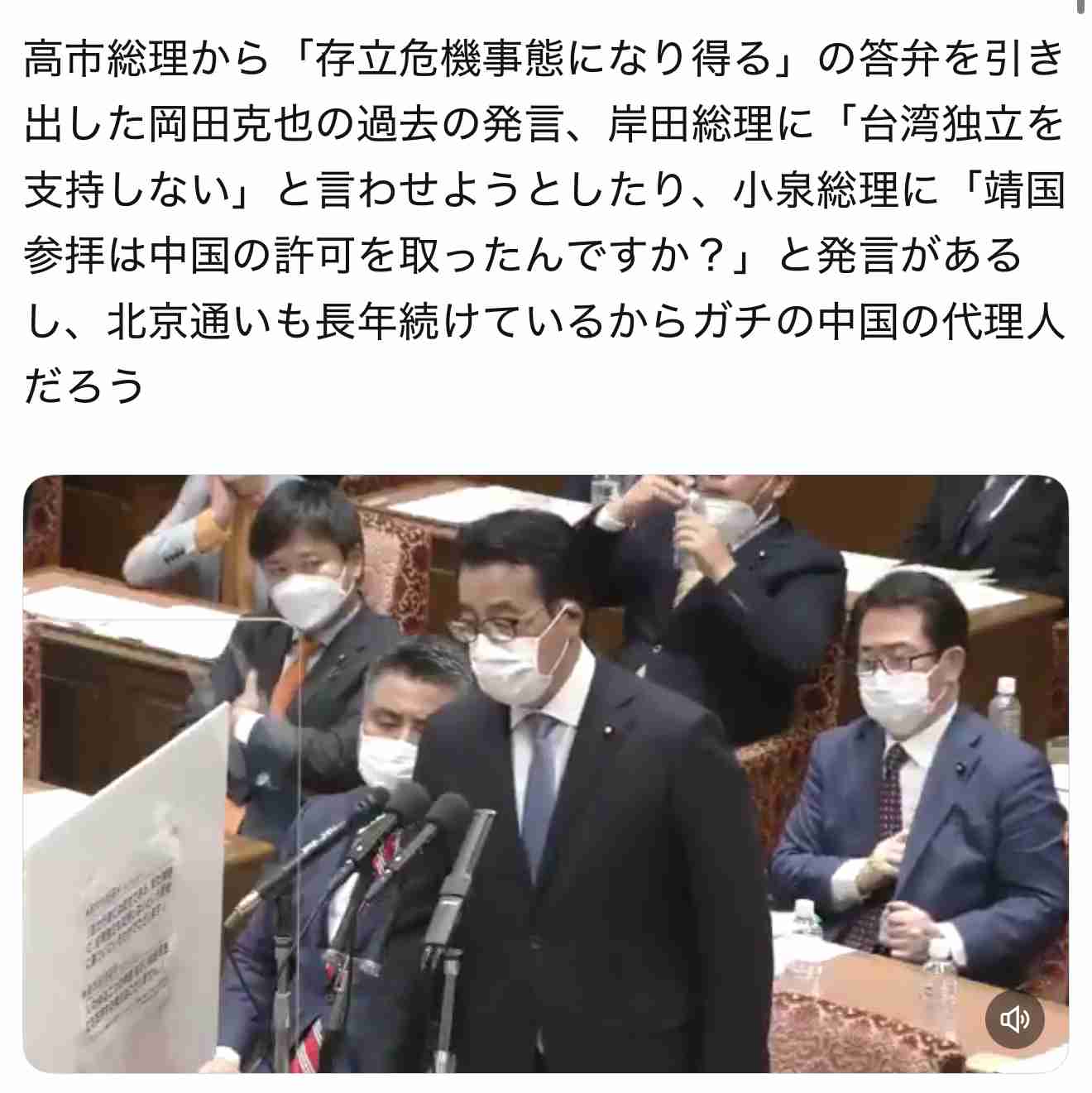 高市総理から「存立危機事態になり得る」の答弁を引き出した岡田克也の過去の発言、岸田総理に「台湾独立を支持しない」と言わせようとしたり、小泉総理に「靖国参拝は中国の許可を取ったんですか?」と発言があるし、北京通いも長年続けているからガチの中国の代理...