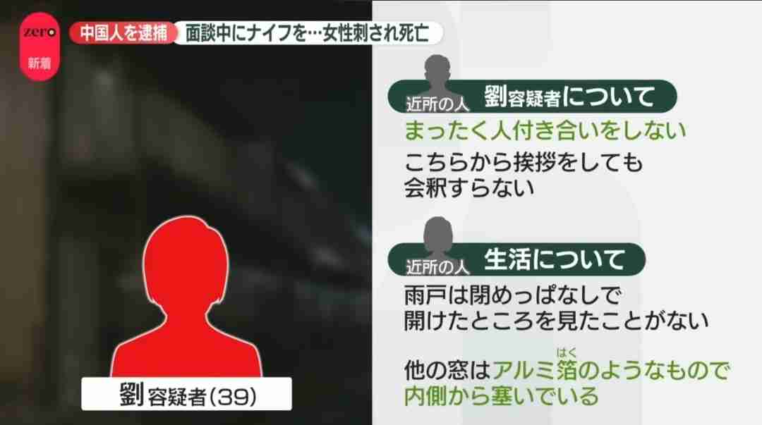 ・劉容疑者は事件当時、立石さんと面談中だったとみられ、取り調べに対し、「家から持ってきたナイフで刺したことに間違いありません」と容疑を認めている+21
