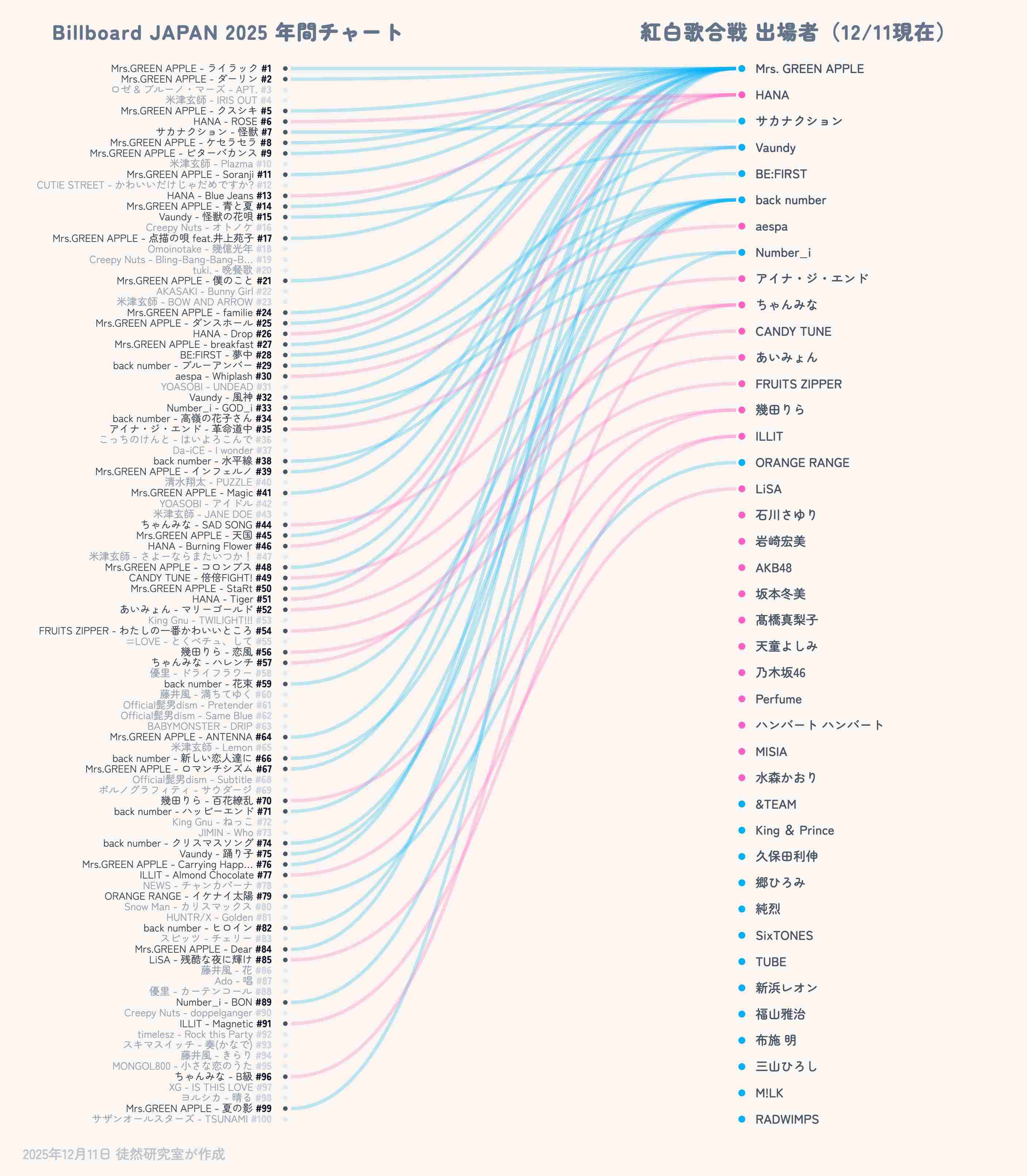 「紅白出場者」と「Billboard JAPAN年間チャート」の関係を視覚化しました。演歌含めて半数以上が年間チャートに登場していない出場者ですが、昨年はここからB'zさんへの大熱狂が生まれているのが興味深いところです...! https://t.co/Cgn30hJ2HQ https://t.co...
