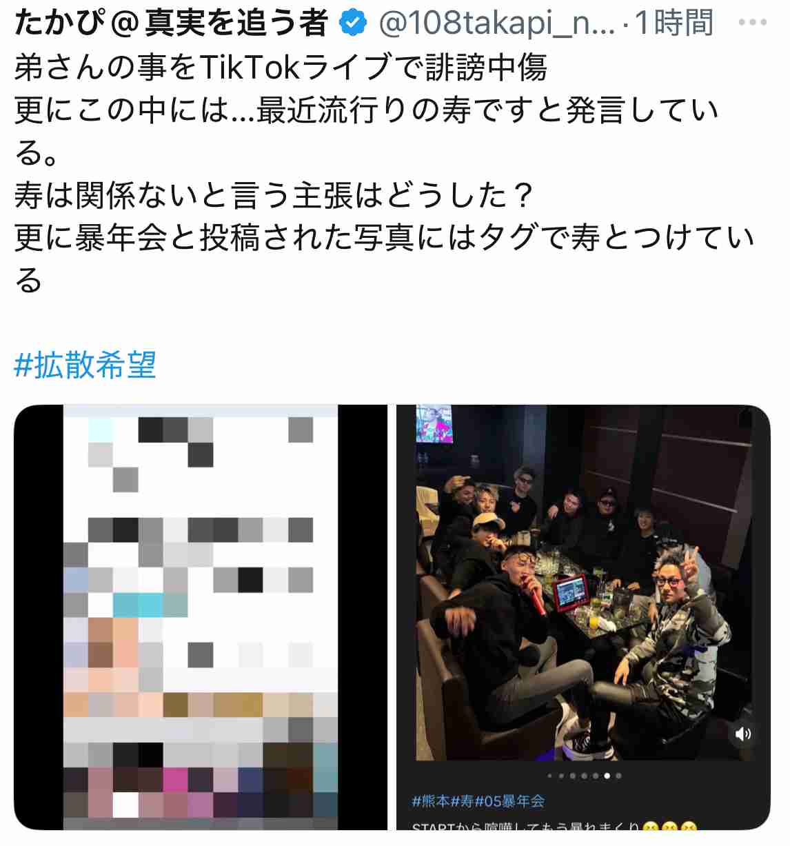 弟さんの事をTikTokライブで誹謗中傷 更にこの中には…最近流行りの寿ですと発言している。 寿は関係ないと言う主張はどうした? 更に暴年会と投稿された写真にはタグで寿とつけている #拡散希望 https://t.co/TANtLlY5ym https://t.co/dJEzkVYHHl