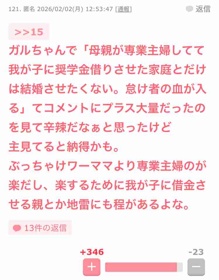 でも専業主婦で奨学金のトピ(今めちゃくちゃ勢い伸びてる)では専業主婦で奨学金借りさせるの猛批判されてたね