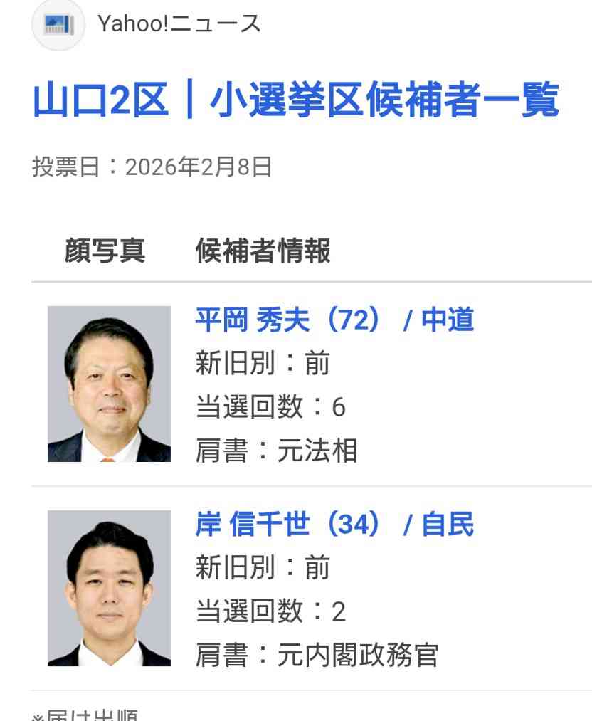 山口2区は信千世氏の所なんだね。中道もどうかと思うけどノブッチョは落ちて欲しいね。私も自民圧勝は嫌だから明日他に投票する。![]()