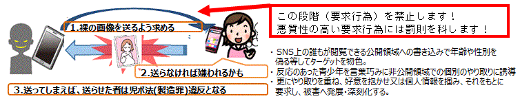 「要求されるままに青少年が画像を送信してしまえば、送信させた者は児童ポルノ禁止法(第7条第4項の製造罪)の処罰対象」+1