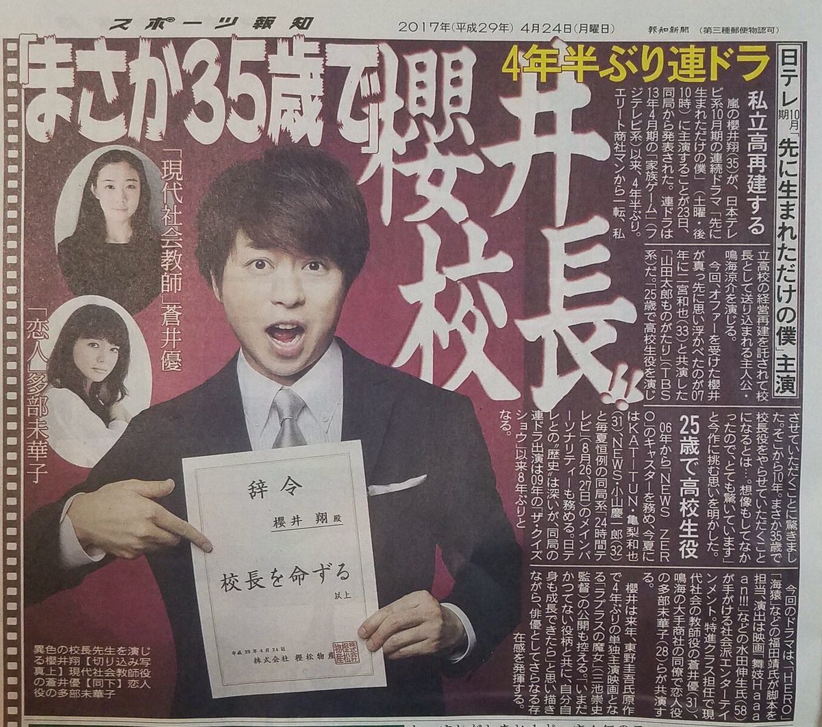 嵐・櫻井翔、10月ドラマで"元商社マンの校長"に「自分自身も成長できたら」girlschannel.net人気グループ・嵐の櫻井翔(35)が、10月より放送される日本テレビ系連続ドラマ『先に生まれただけの僕』(毎週土曜 後10:00)で主演することがわかった。櫻井が演じるのは、元エリート商社マンながら会社の辞令で私立高校の“校長”に就任した鳴海涼介(35)。現職の教師で最初は鳴海に反発しながらも触発されていくヒロイン・真柴ちひろ(31)には女優・蒼井優、鳴海の恋人で元同僚・松原聡子(28)には多部未華子が起用された。
