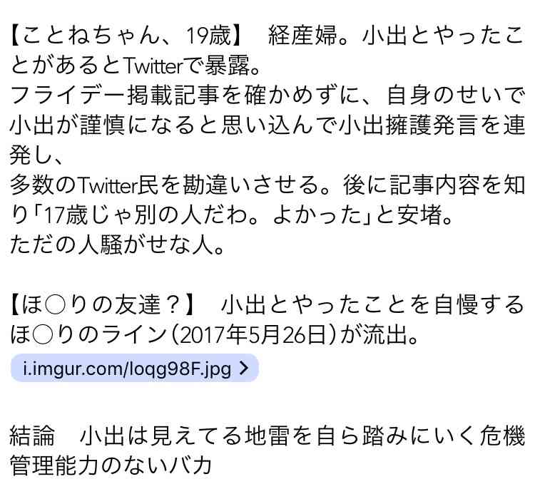 多分女の方に、ベッド写真、音声、line、どれか決定的にヤバいモノを握られてて、小出君を捨ててでも全面降伏するしかなかったんだろうね。