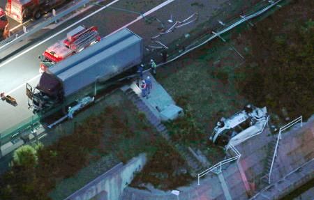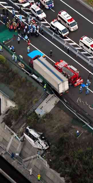バスの運転手の岡本さんは事故当時、車外にいた。バス会社などによると、午後4時過ぎに岡本さんから「エンジントラブルで路肩に止まっている」との電話があった。出発前の点検では、エンジンなどの異状は確認されていないという。現場は片側1車線。バスを路肩に止め、代替バスを待っていたという。