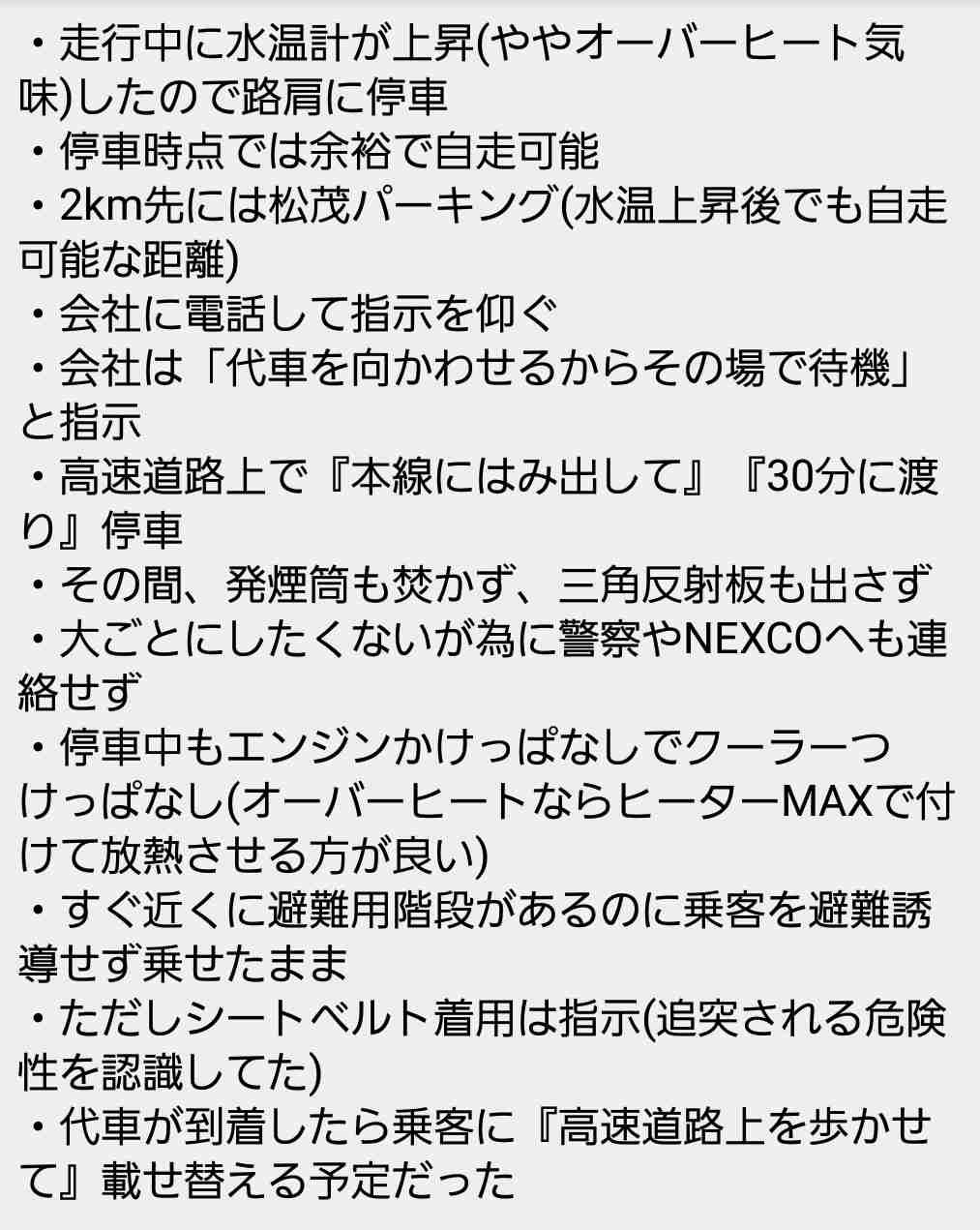 高速で路肩に停まること自体が危険であるというのはまあ事実だよね、今回は車の故障だから仕方なかったのだろうけど。
