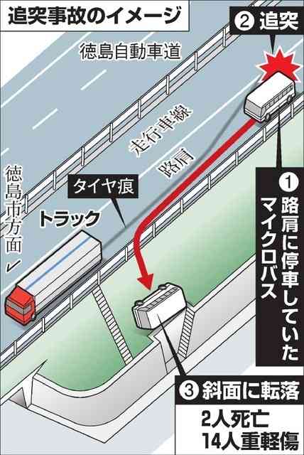 鳴門市大津町大幸の徳島自動車道下り車線で25日、路肩に停車中のマイクロバスに大型トラックが追突し2人が死亡、14人が重軽傷を負った事故で、自動車運転処罰法違反(過失致死)の疑いで逮捕された松山市南久米町、トラック運転手菊池誉司(たかし)容疑者(50)が県警の調べに「前をよく見ていなかった」と供述していることが26日、捜査関係者への取材で分かった。県警は菊池容疑者の前方不注視が事故の原因とみて詳しく調べている。