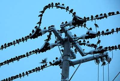 うちのすぐ脇の道の電線の上に大量のムクドリが来る