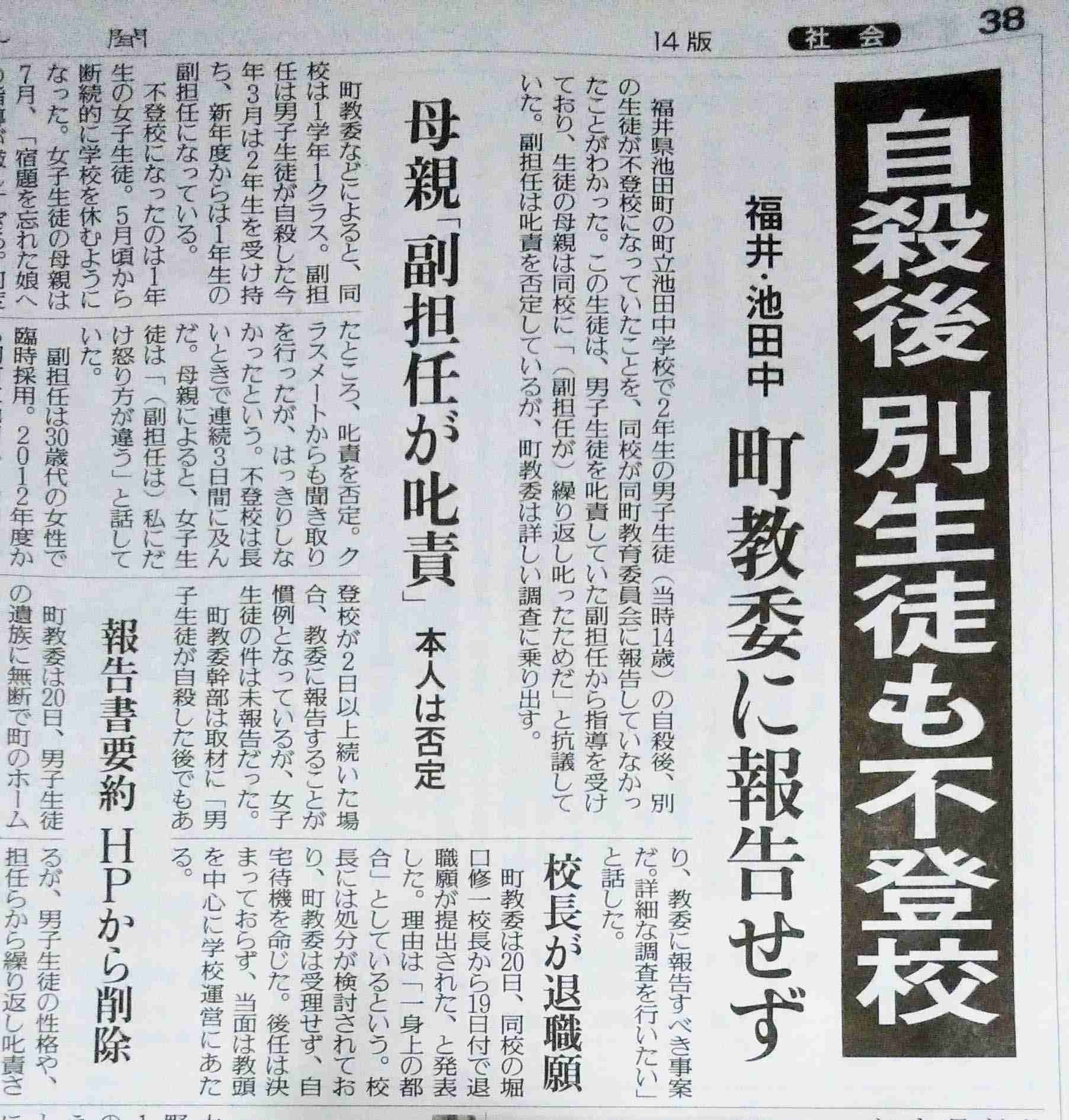 福井県池田町の町立池田中学校で2年生の男子生徒(当時14歳)の自殺後、別の生徒が不登校になっていたことを、同校が同町教育委員会に報告していなかったことがわかった。