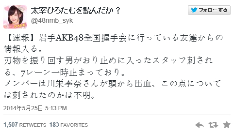 「AKB握手会で川栄李奈が頭から流血」はデマ!!!情報が錯綜する中、責任者が正式に釈明 - NAVER まとめmatome.naver.jp「AKB握手会で川栄李奈が頭から流血」はデマ!!!情報が錯綜する中、責任者が正式に釈明のまとめ