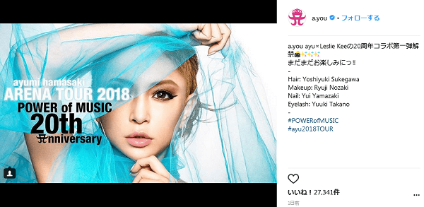 歌手の浜崎あゆみ(39)が27日、自身のインスタグラムとツイッターに投稿した内容が話題となっている。 ~略~ 浜崎が最近、自身のインスタグラムとツイッターで「ayu×Leslie Keeの20周年コラボ第一弾解禁。まだまだお楽しみにっ‼」というコメントともに写真を投稿。今年20周年を記念したライブツアーの情報を解禁した。