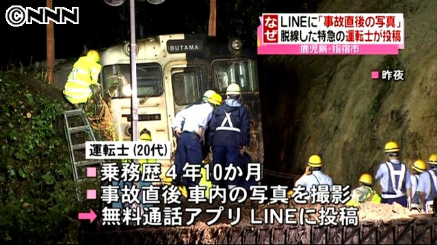 JR九州によると、男性運転士は事故を会社に報告するとともに、ニュースを見て「けがはないか」と心配する知人に、ラインで「死ぬかと思った」「脱線している」などと絵文字付きで返信。その際、携帯電話で車両の内部や外からの様子を撮影した写真2枚を添付した。指宿枕崎線脱線:運転士、直後の写真添付しLINE投稿 - 毎日新聞mainichi.jp鹿児島県のJR指宿枕崎線で観光特急「指宿のたまて箱2号」が脱線し15人が重軽傷を負った事故で、男性運転士(28)が無料通信アプリ「LINE」(ライン)に事故直後の車内などの写真を添付して「死ぬかと思った」などと投稿していたことが分かった。JR九州が23日明らかにした。