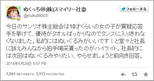 今日のサンリオ株主総会は10才くらいの女の子が質疑応答手を挙げて、優待がタオルばっかりなのでタンスに入りきれなくなりました。私的にはぬいぐるみがいいです!と堂々と社長に訴えみんなから拍手喝采貰ったのがハイライト。社長的には次回はぬいぐるみやりたい、やらせましょうと前向き回答。