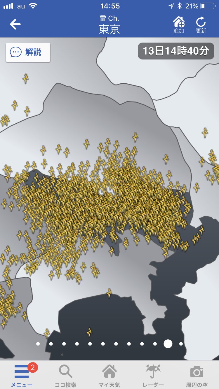 東京の西のほうに住んでますが、30分以上ものすごい雷雨が続いていて恐怖です…。