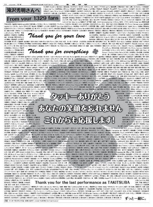 滝沢さんへの感謝を伝えるために新聞広告を出そうとファンが動き、集まった金額は約400万円。滝沢さんが引退する12月31日に「タッキーありがとうの会」として、広告を出した。四つ葉のクローバーがデザインされ、「ずっと一緒に。」という言葉が添えられている。+342