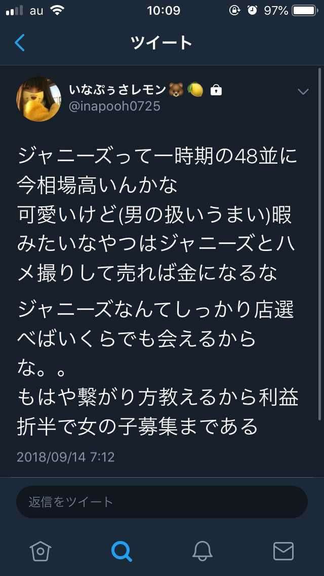 文春に売ろうとしてたのは確か。ちなみに、ニュース小山の小夏ターゲット!の一般人小夏は中井りかと交流があり、ジョー会から漏れた?との憶測もある。中井りかは昔熱心な藤ヶ谷オタだったからジャニオタつながりで小夏も仲良かったようだね。この事件と関係あるかはうわさの範囲だからトピ違いすまんな+27