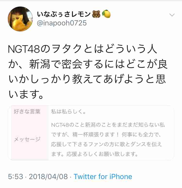 太野の性格は、ヲタは揃って悪いと言ってた。以前も別のメンバーをいじめの対象にしていたらしい。太野のInstagramを見に行って、コメントから良く解る。元ファンとか、NGTのファンからのコメントと見受けられる。稲岡やジョー会と繋がっていれば、態度がでかくなるよね。威張ってたんじゃないかな。