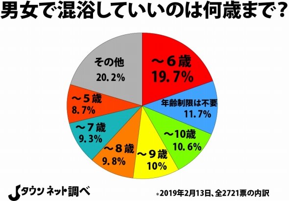 Jタウンネットでは15年7月31日から19年2月12日まで「銭湯で、男の子を『女湯』(or女の子を『男湯』)に入れていいのは何歳までか調べてみた」というアンケートを実施。