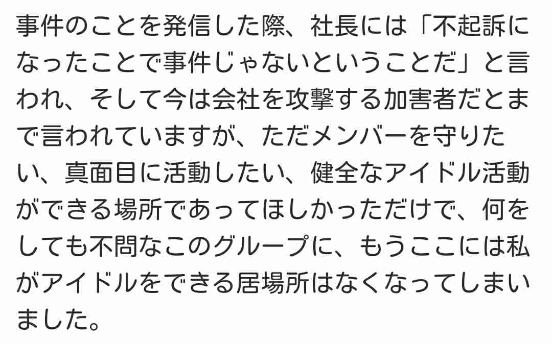 私的にはそれ+、AKSにて隠蔽を測ったことにてAKSが謝罪と原因説明、被害妄想と嘘ついたことにてあの会見の三人のスポンサーに対する謝罪は求めるなあ。+16