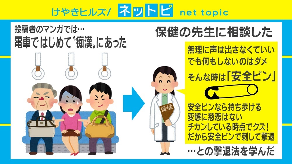マンガで紹介された“痴漢対策”に賛否が集まっている。 Twitterに投稿された「人生初めての痴漢被害にあった時保険の先生が言ったこと」というマンガ。中学生の時に電車で痴漢にあい、その話を保健の先生に相談したところ「無理に声を出さなくていい。でも何もしないのはダメ」と安全ピンで刺して撃退することを勧められたという。投稿者は「でも血出るし」とあわてふためくが、その先生は「痴漢している時点でそいつはクズ」「変態に慈悲はない」と切り捨てたという。