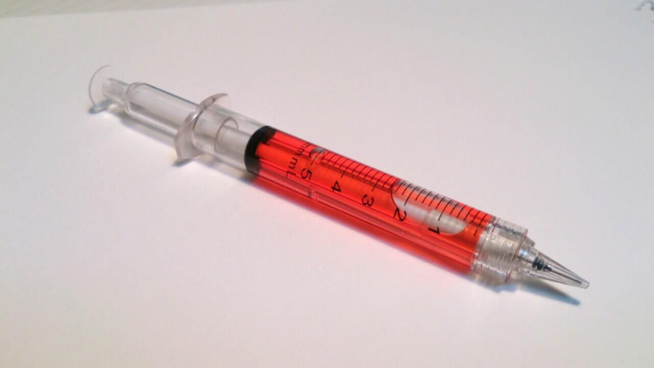 先生が使ってた注射器でインク注入する赤ペン