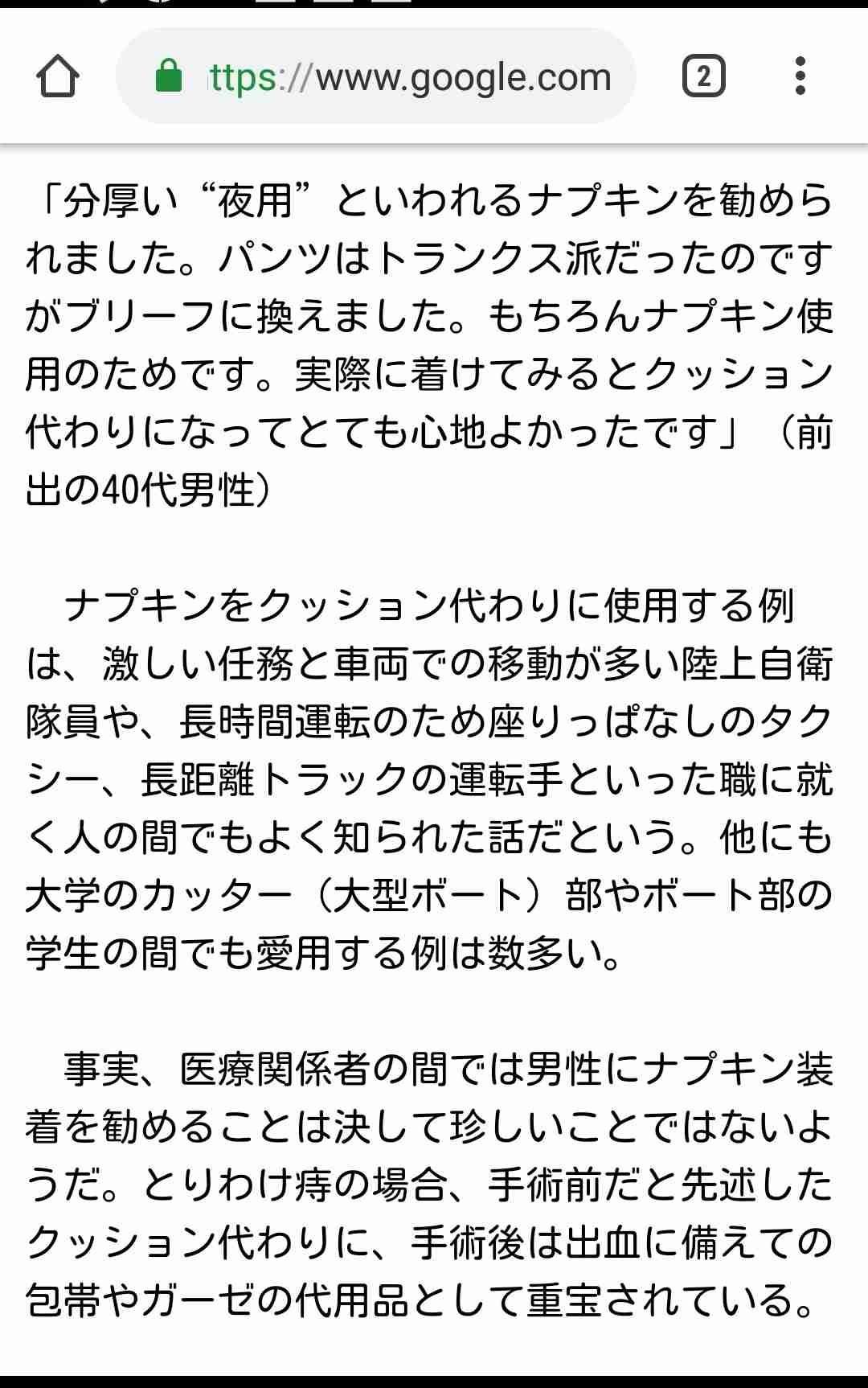 意外!? 女性用ナプキンを“愛用”する男性たち (1/2) 〈dot.〉|AERA dot. (アエラドット) dot.asahi.com女性用生理用品「ナプキン」を使う男性がいる――はたして何のために使っているのか。実はこのナプキン、意外な転用が可能なのだという。そんな男性の利用者の声を聞いてみた。「最初着けたときはなんだか気恥ずか...