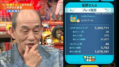 ![笹野高史、スマホゲーム「ツムツム」に50万以上の課金ww]()