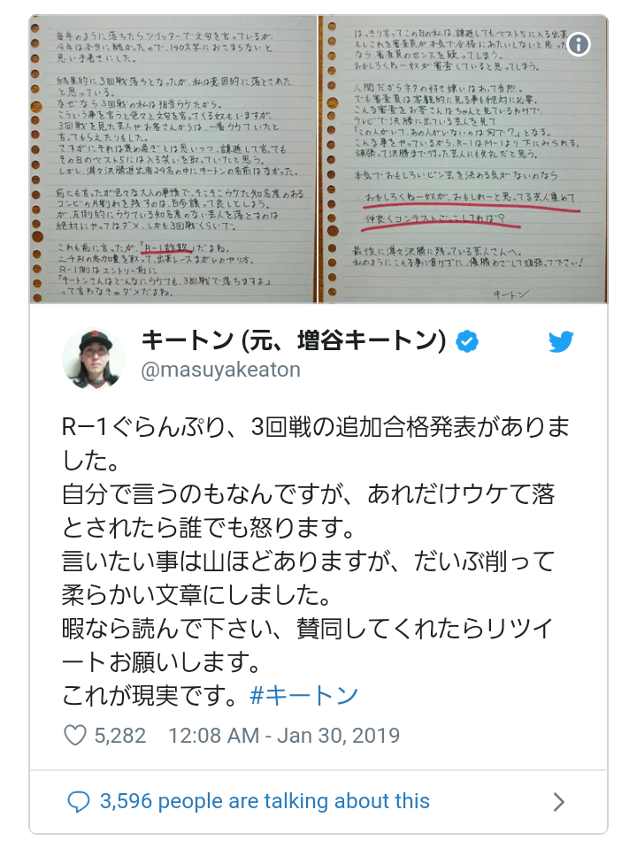 キートン、闇営業問題で長文ツイート「嫌なのが、綺麗事ばっかりいってる芸能人ですかね」 : スポーツ報知hochi.newsお笑い芸人・キートン(45)が1日、自身のツイッターを更新。反社会的勢力の会合に出演したとして、吉本興業の芸人らが謹慎処分を受けた闇営業問題について、現在の思いを記した長文のツイートを公開した。