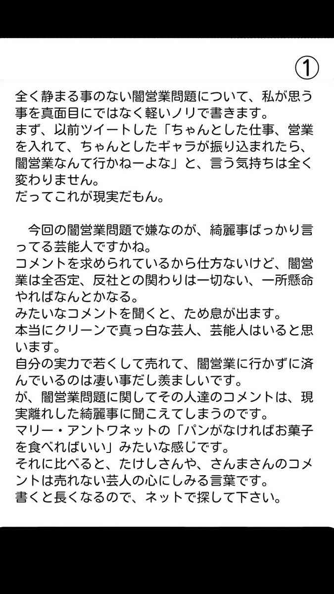 直営業を芸人はじゃんじゃん受けたら、良いのに。だって、契約書を取り交わしてないんでしょ。だったら、契約社員でも無ければ、社員でもないんでしょ。吉本興業に文句言われる筋合い無いし、なんでこんな扱いされても義理堅く会社通してるのか??反社会的勢力への営業だけ気を付けたら良いんだし。宮迫は嘘をついたから、ダメなだけでしょ。