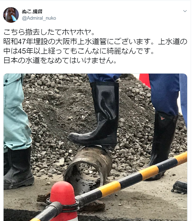 水道管ちゃうし。表面泥ついてないし。表面錆びてないし、上水道管ちゃうやん。