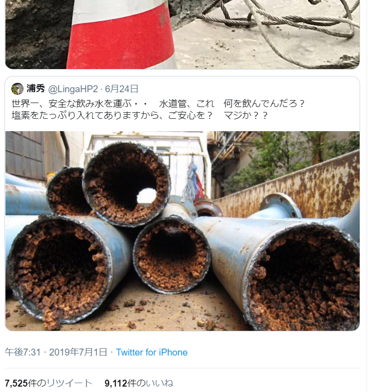 ネットで出回る「サビだらけの水道管」写真 こんなことあり得るの?行政・メーカーに聞いた : J-CASTニュースwww.j-cast.comサビまみれのパイプが何本も転がっている写真を、インターネットで見た方はいるだろうか。写真は主に「実はこんなに汚い日本の水道管」と称して、ネットで不安を煽るような使われ方がされていた。しかしこれに対し、日本の水道管で使われているものではない、デマであるという見解もネットユーザーから出ている。本当に水道管に大量に錆が付着することはあるのか。専門的な見解を聞いた。