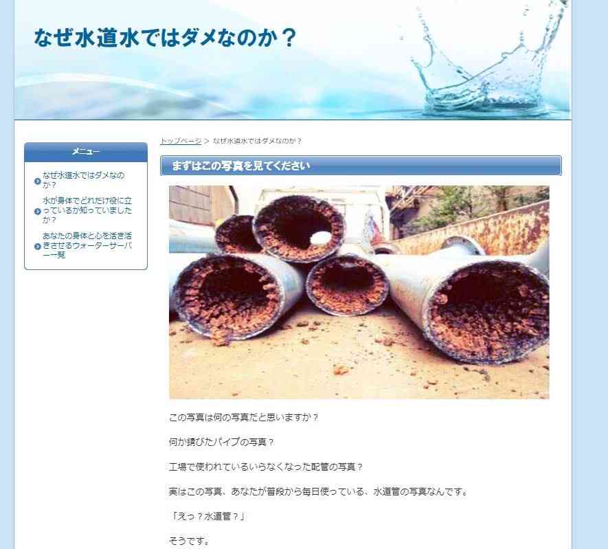 【デマ】「水道管は錆びだらけ」という意味合いで不安を煽る呟きに、大量のツッコミが入る様子【フェイクニュース】 - Togettertogetter.com浄水器やウォーターサーバーとかを売りつける怪しげな会社が、不安を煽る為によく使われる画像らしいです。また、画像自体は工場用の配水管であり、水道管とは考え辛いようです。そして、管に付いているものは錆..
