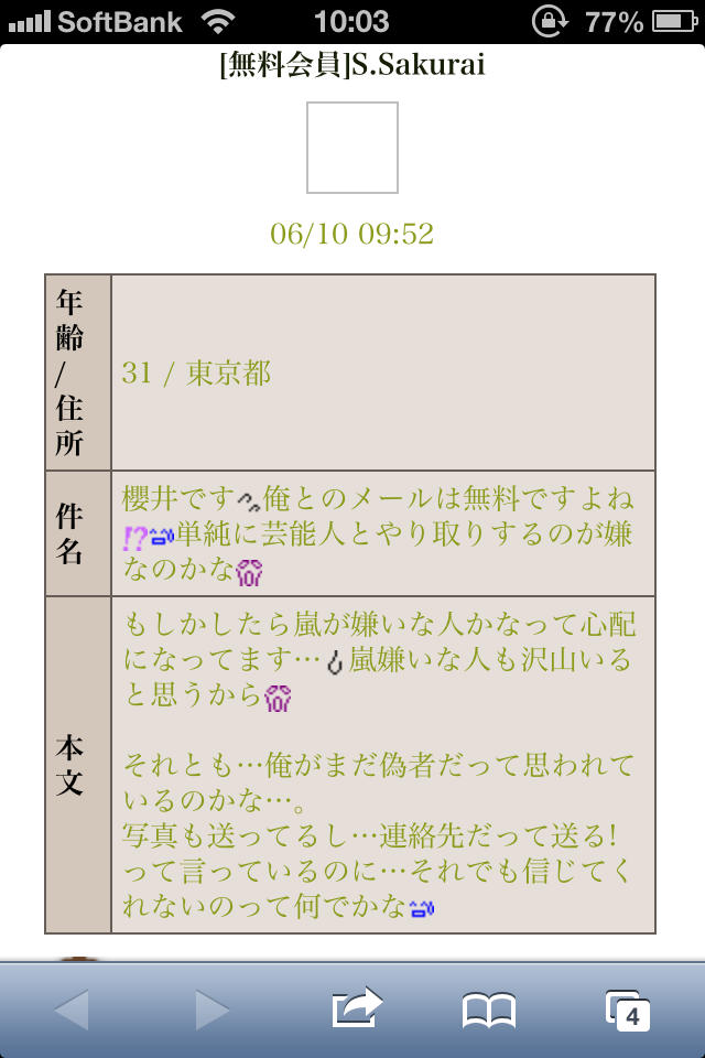 芸能人じゃ無くても「友達から紹介されたのでメル友になりませんか?」て変なメールにも騙されないのに、芸能人なんて絶対にありえない!+4